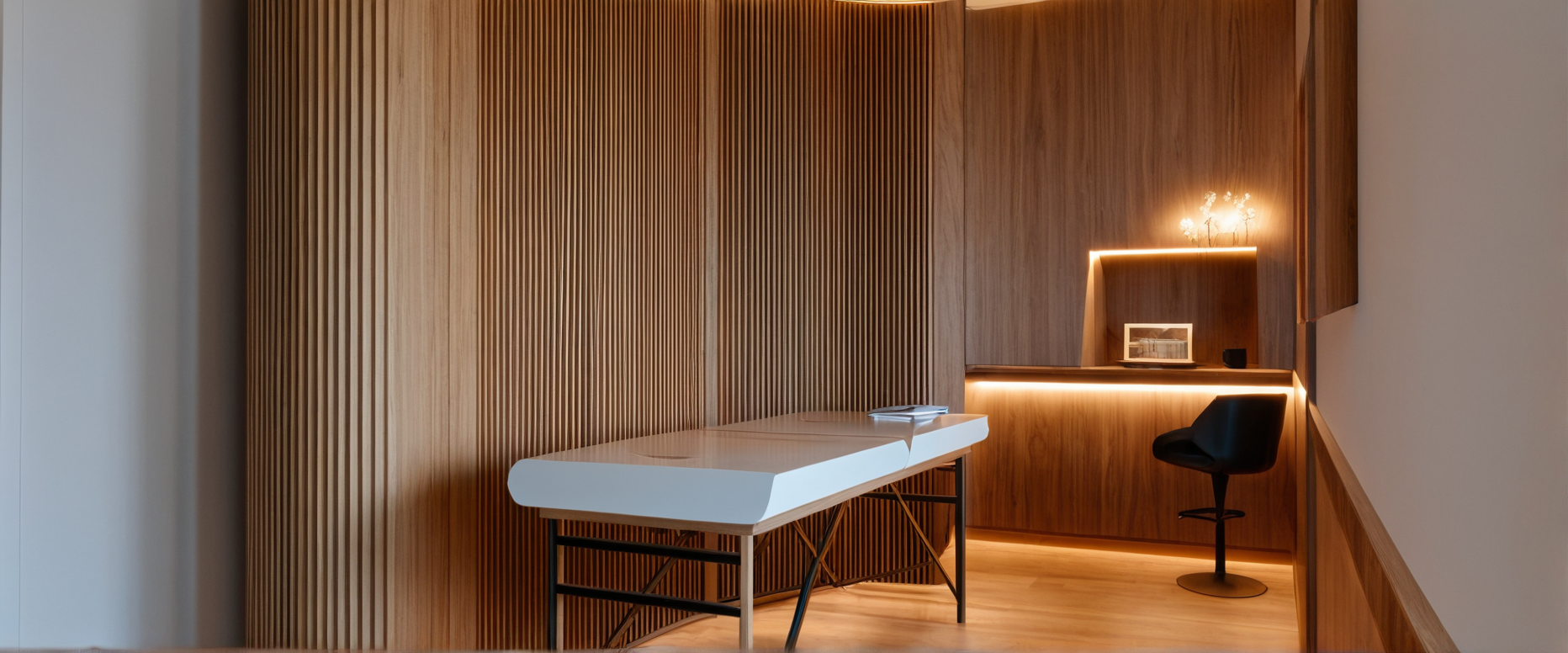 Transformation d’un garage brut et décloisonné en un Cabinet sophistiqué et tout confort. Conforme aux normes ERP -dont les normes PMR, pour une accessibilité maîtrisée.