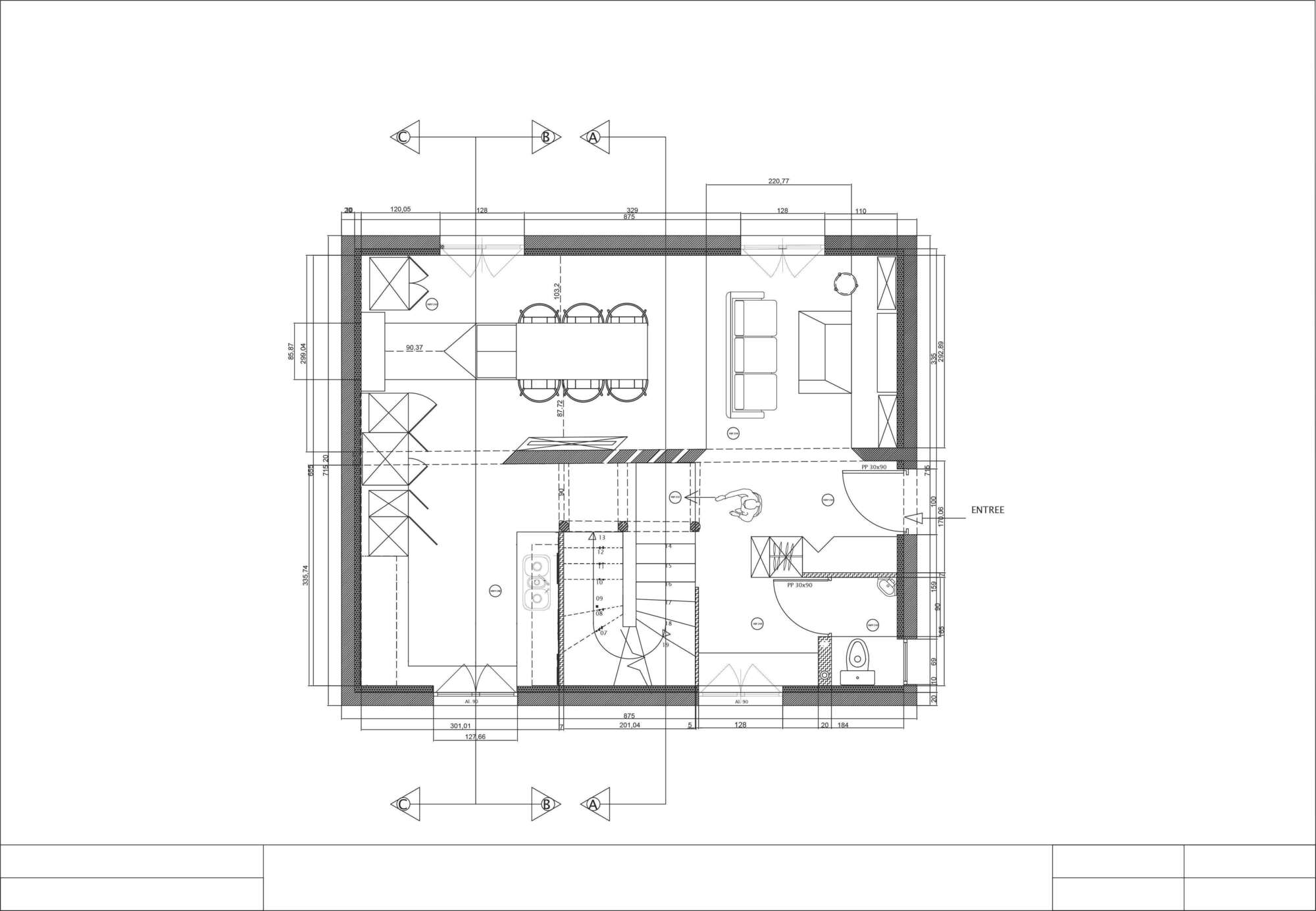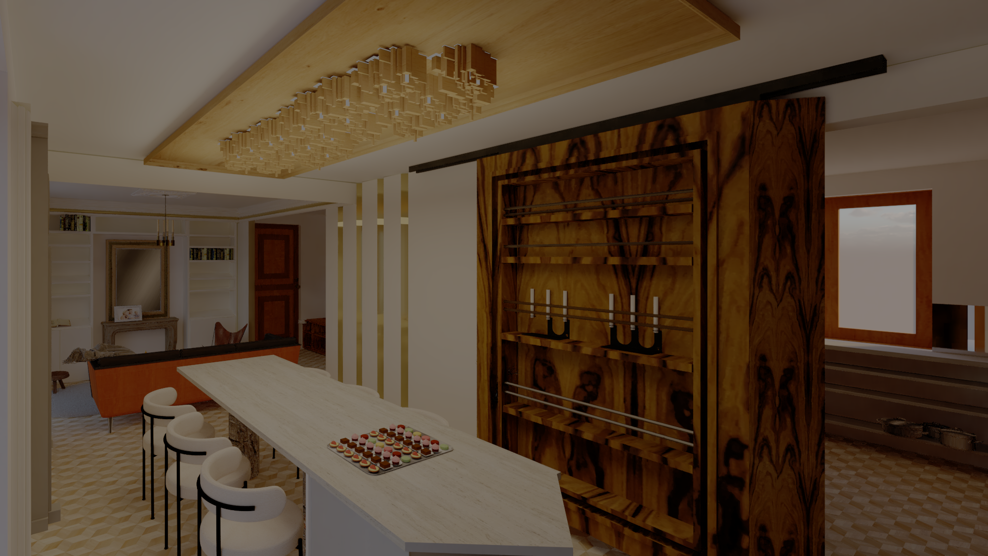 Transformation d’un hall d’escalier aux larges proportions, mais sombre, sans personnalité et aux murs couverts de “pop corn”, en un espace enveloppant à l’effet “woaw” et dans lequel les clients adorent danser lorsqu’il reçoivent !